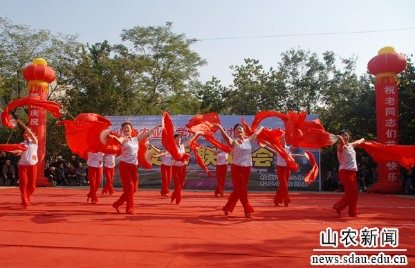 今天的“夕阳红”广场披上了节日的盛装,鲜花、彩球和大红地毯把联欢会的气氛烘托得隆重而热烈。下午2:30,联欢会在老年器乐队的民乐合奏《沂蒙山小调》和《茉莉花》那优美的旋律中拉开帷幕。在近2个小时的时间里,老年艺术团和大学生艺术团两代人,先后表演了女声小合唱、太极云波扇、舞蹈、京剧联唱、中老年服装模特表演、中老年健身操、琴与剑、大合唱表演等十余个文体节目。