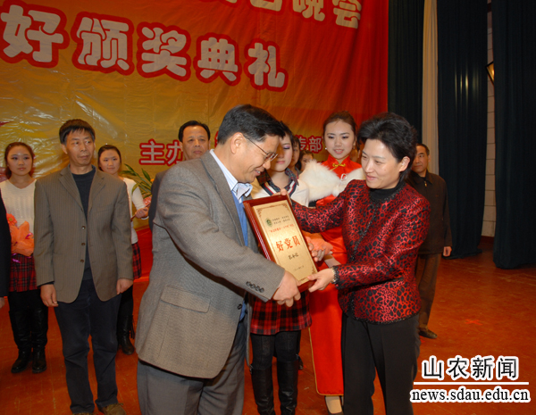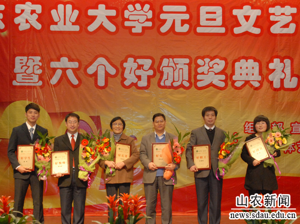 节目中间的“六个好”颁奖典礼一次次把晚会的热烈氛围推向高潮。第二届“身边的感动――六个好”评选活动,是围绕b体育官网创先争优、争做科教兴农先锋而开展的一项重要活动。在创先争优活动中,各基层党委高度重视,广大党员积极参与,奋发向上,求真创新,涌现出一大批优秀团队和个人,此次受到表彰的“六个好”就是他们中的优秀代表。“身边的感动――六个好”评选活动得到全校师生的热烈响应,大家踊跃投票,推荐身边的榜样。经过网络投票、现场投票,最后,泰山学者孔令让教授获得好党员称号、外国语学院学生张敏获得好团员称号、植保学院李向东教授获好教师称号、体艺学院学生黄帅获好学生称号、经管学院办公室副主任王园林获好职工称号、农学院退休教授孙兰珍获好长辈称号。另外54名正式候选人获得提名奖。校领导依次走上主席台,向获奖者颁奖、祝贺,合影留念。