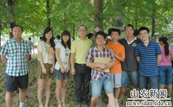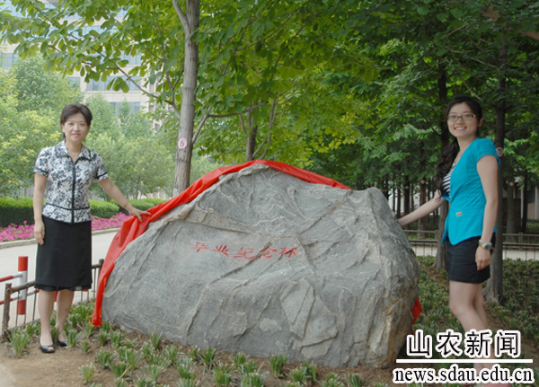 毕业生在自己学院的毕业纪念树前留影