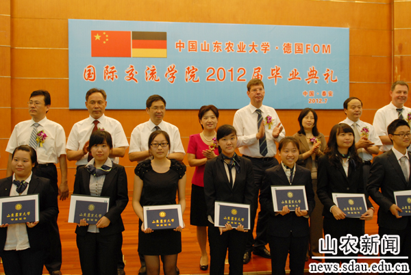 7月5日,学校隆重举行国际交流学院2012届学生毕业典礼。德国“F O M”经济管理应用技术大学校长海迈尔教授、教务主任史密斯教授、德国“FOM”驻泰主任海德勒博士,学校领导邢善萍、张宪省、车先礼,以及学校有关部门和国交学院、经管学院的负责同志出席毕业典礼,并为毕业生颁发毕业证书。