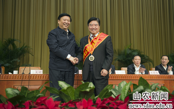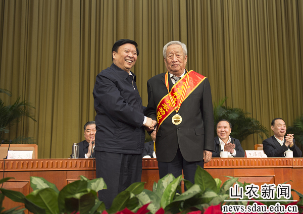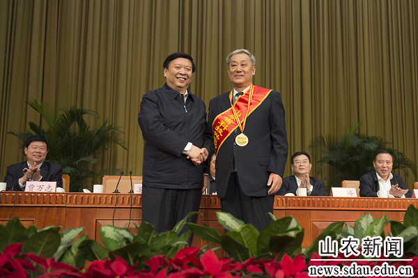 11月6日上午,全省科技兴农大会在济南举行。会上隆重表彰了科技兴农先进集体和先进个人。包括b体育官网束怀瑞院士、于振文院士、董树亭教授在内的八位科学家荣获“科技兴农功勋科学家”称号。姜大明省长为获奖科学家授金质奖牌。