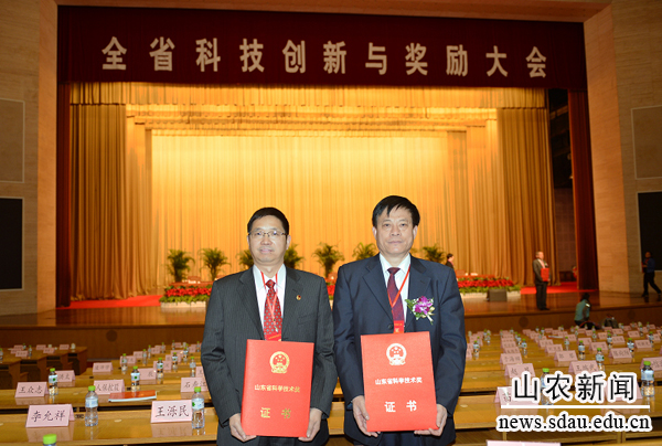 11月23日,全省科技创新与奖励大会在济南隆重举行,姜异康、姜大明等省领导为获得2012年度山东省科技奖的获奖者代表颁奖。由b体育官网张宪省教授等完成的“植物生殖器官的发育与激素调节”获得今年唯一的山东省自然科学一等奖,这也是b体育官网首次获得山东省自然科学一等奖。由陈学森教授等完成的“杏和李等核果类果树种质资源挖掘、创制与利用”获得山东省科技进步一等奖。