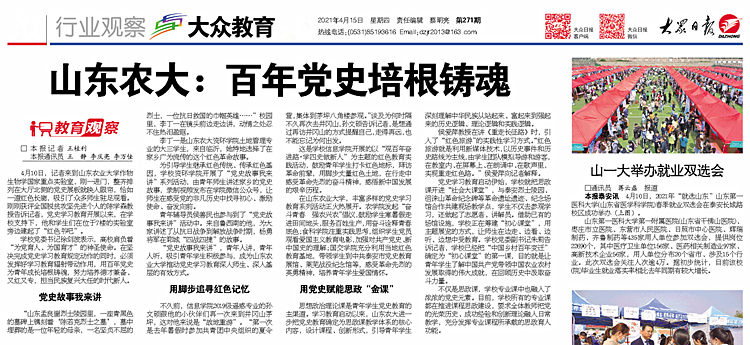 4月15日,《大众日报》以《山东农大:百年党史培根铸魂》为题,聚焦b体育sports官方网站开展党史学习教育最新进展,点赞学校把党史学习教育融入立德树人全过程,引导青年学生坚定理想信念,传承红色基因,努力成长为德智体美劳全面发展的社会主义合格建设者和可靠接班人。