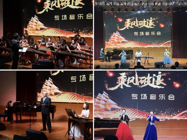 “乘风破浪”专场音乐会在原创室内乐合奏《盛世欢歌》热烈的音乐声中拉开序幕。双钢琴演奏《红旗颂》诉说了家国情怀,小提琴独奏《泰伊斯随想曲》、民乐三重奏《大鱼海棠》和萨克斯管二重奏《永恒的记忆》经典旋律曲声悠扬,令人陶醉;男声独唱《春花秋月何时了》、女声独唱《温暖》通过不同风格的中国声乐作品,带给大家美的听觉享受;独舞《灵》通过肢体和舞姿表达“万物有灵”的文化思想。精彩的表演,赢得了观众的阵阵掌声。