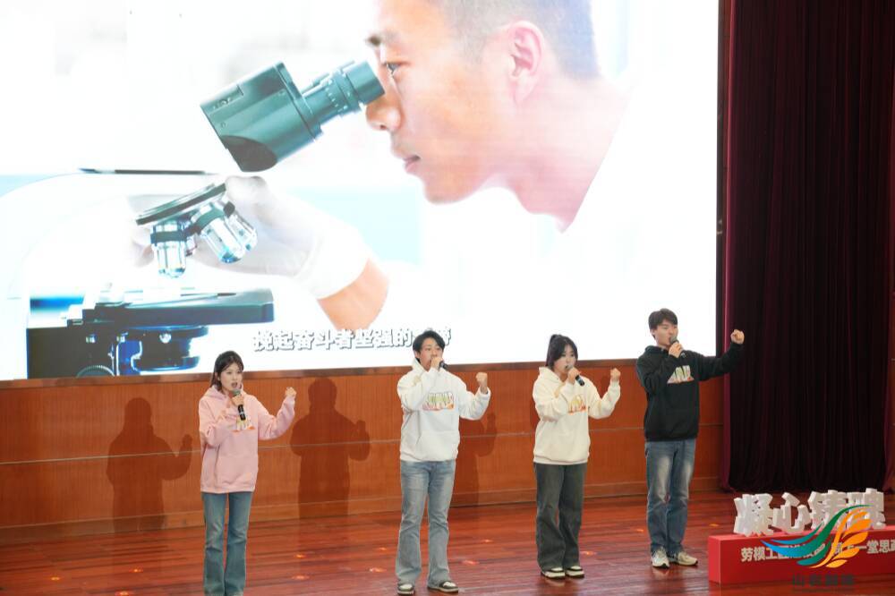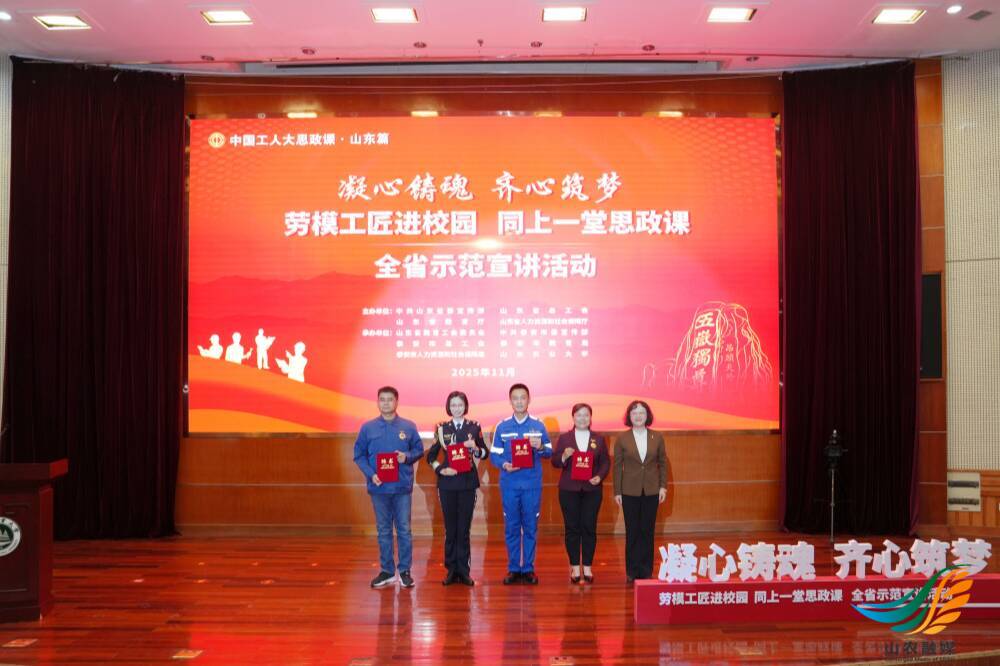 活动特别邀请全国农业农村劳动模范、泰安市劳动模范,泰安市岳洋农作物专业合作社理事长,农民正高级农艺师薛丽娜;全国劳动模范,泰山玻璃纤维有限公司研究院电子纤维技术带头人李伟;全国优秀人民警察、山东省先进工作者,烟台市公安局牟平分局养马岛派出所二级警长曹园媛;全国五一劳动奖章获得者,山东港口青岛港桥吊司机、国家级技能大师工作室领办人郭磊四位劳模工匠,以亲身经历,讲述他们在各自行业领域的成长成才故事,分享将个人发展融入时代大潮的心得体会和宝贵经验,生动诠释“三个精神”的深刻内涵,讲述了一堂凝心铸魂、齐心筑梦的生动思政课。