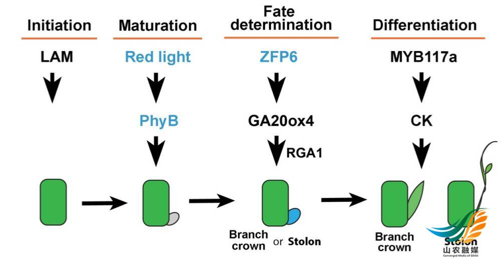团队通过对草莓的各种腋芽组织进行精细的植物学观察和解剖,结合大数据分析、遗传分析和基因编辑等手段,发现红光可促进腋生分生组织的成熟——这是一个此前未被发现、先于命运决定的发育阶段。并且进一步分离得到一个此前未知的草莓腋生分生组织命运决定的调控因子ZFP6,该锌指蛋白特异性在成年期腋生分生组织中促进匍匐茎的形成,这就像找到了匍匐茎发育的一个开关。