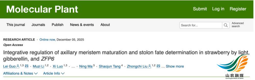 山农融媒12月10日讯 12月8日,园艺学院郭磊/罗熙教授团队联合美国马里兰大学/深圳理工大学刘重持教授团队在国际著名学术期刊《分子植物》(Molecular Plant)在线发表了题为“Integrative regulation of axillary meristem maturation and stolon fate determination in strawberry by light, gibberellin, and ZFP6”的重要研究成果。该研究系统地揭示了草莓腋芽发育过程及命运选择的分子机制,破解了决定匍匐茎发育的关键基因密码,为草莓株型调控及苗木繁育奠定分子育种的理论基础,助力我国草莓产业高质量发展。